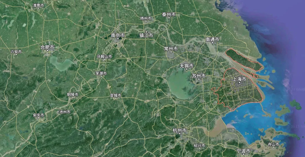 根据 2018 年统计数据,上海全市面积 6340.5 平方公里,南北最长处约 120 公里,东西最宽处约 100 公里。其中市区面积为 2648.6 平方公里。由于东部沿海是由长江不断携带入海的泥沙沉积而成的,因此崇明岛、浦东等地的面积也在缓慢增长中。