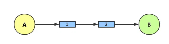 想象一下,你要从 A 地走到 B 地,途中要经过两条桥。一种情况如下所示,你要先经过桥 1,再经过桥 2,我们说两座桥的关系是串联关系。只有当两座桥都畅通的时候才能顺利到达 B 地,只要其中一条桥堵塞都不能到达 B 地,如果两条桥都堵塞肯定也不能到达。这就是 “与” 运算。