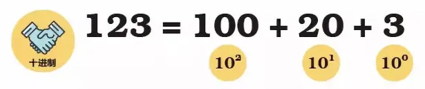 要理解什么是二进制,先要从我们更熟悉的十进制开始。在十进制中,阿拉伯数字 “1” 的后面加上数字 “23” 后,为什么数字 “1” 所代表的意义忽然变成了 100?为什么把三个数字摆在一起,人们马上就会把它们理解为一个 “三位数”?这是因为十进制中,数位之间存在 “10 倍” 递增关系。