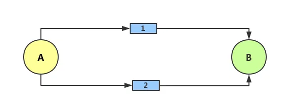 第二种情况如下所示,还是有两座桥,但是两座桥的关系是并联关系。如果桥 1 堵塞,我们还可以选择桥 2,反之亦然,只有当两座桥同时堵塞的时候才不能达到 B 地。这就是 “或” 运算。
