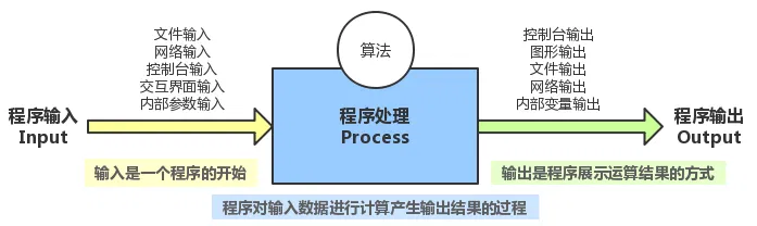 - 程序的输出:控制台输出、图形输出、文件输出、网络输出、操作系统内部变量输出等。输出是程序展示运算结果的方式。