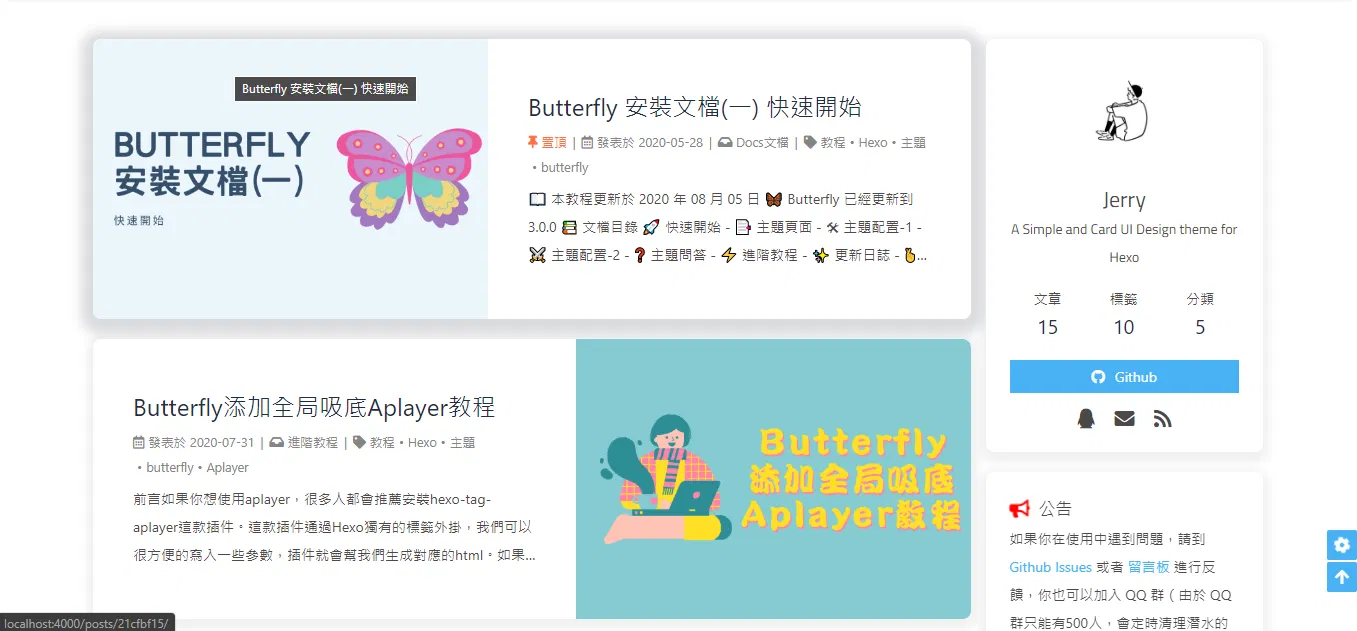 Butterfly 是 Jerry 在 hexo-theme-melody 主题的基础上进行开发,支持多种美化魔改、多功能组件及静态部署集成的 Hexo 主题。