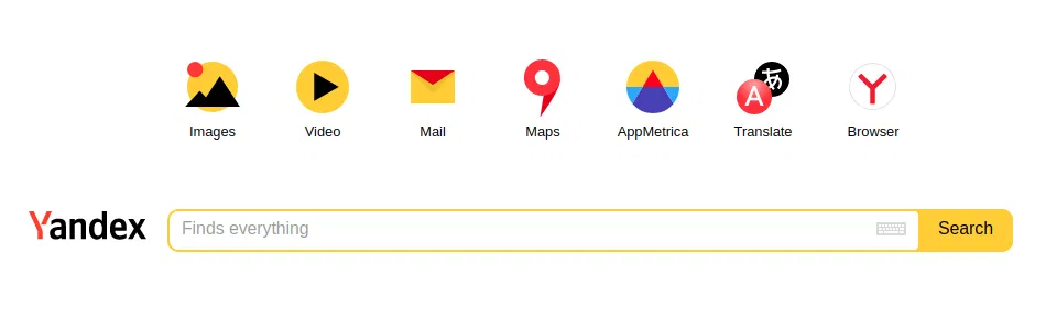 Yandex 号称 “东欧第一搜索门户”,是俄罗斯网络拥有用户较多的网站。Yandex 的服务包括搜索、最近新闻、地图和百科、电子信箱、电子商务及其他服务。Yandex 非常注重区域网站工作,所有的服务都考虑到了使用者的地理位置:可以在区域网站上搜索,“新闻” 里提供地方信息,“市场” 里首先就提供地区商店的物品。