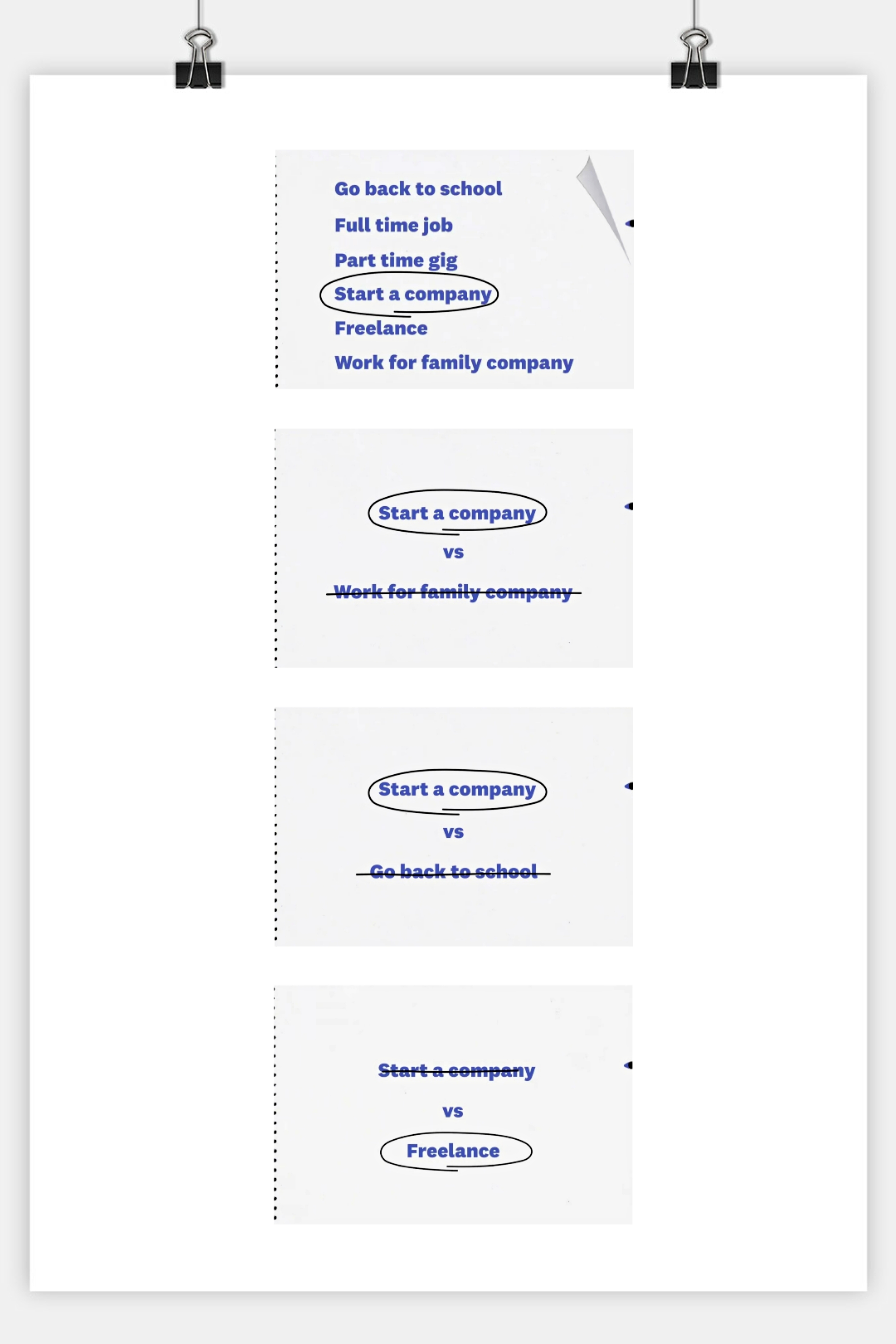 正是因为风险高,所以我们必定想做出正确决定。首先,你可以先凭直觉选出一个最佳选项,然后将其他选项与该最佳选择进行逐一比较,从两个选项中选出一个并淘汰另一个。具体操作可以采用我之前介绍的 WADM 加权平均决策矩阵 方法。