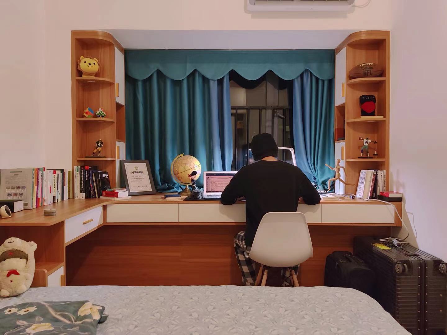 静态部分则采用定制家具方案。由于小户型的三个房间面积都不大,为了提供更多功能和收纳空间,采用了较多静态设计(就是说安装好了之后就动不了了)。例如,主卧的飘窗做成了一个大桌子,这样既能很好地利用窗户采光,又节省了额外摆放书桌的位置。