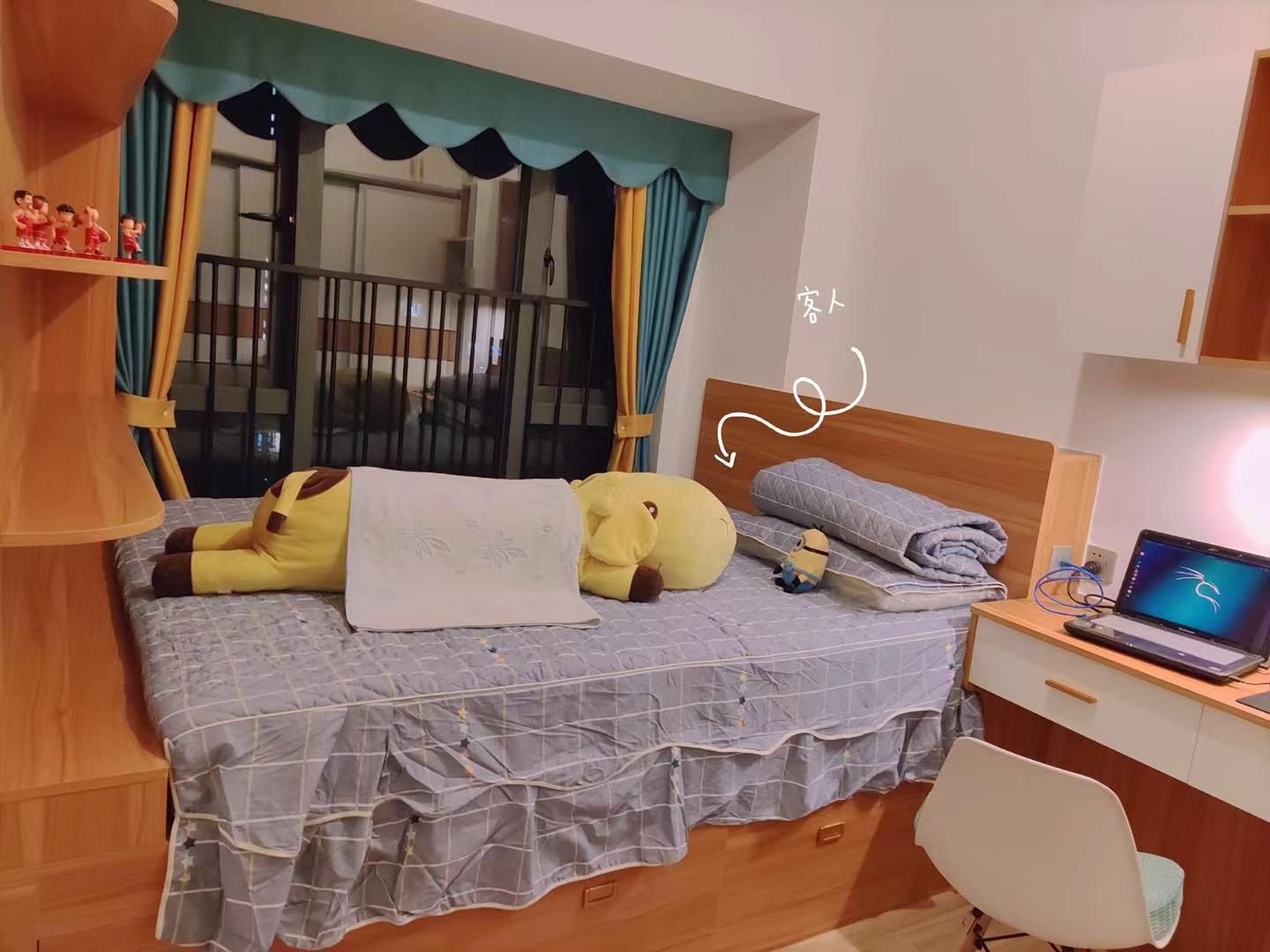 同样,次卧也采用静态设计,飘窗延伸出来做成榻榻米,然后与书桌、衣柜连成一体,虽然除了椅子之外其余部分都无法移动,不过胜在能有效利用空间。留出了更多活动空间,不至于显得太压抑。