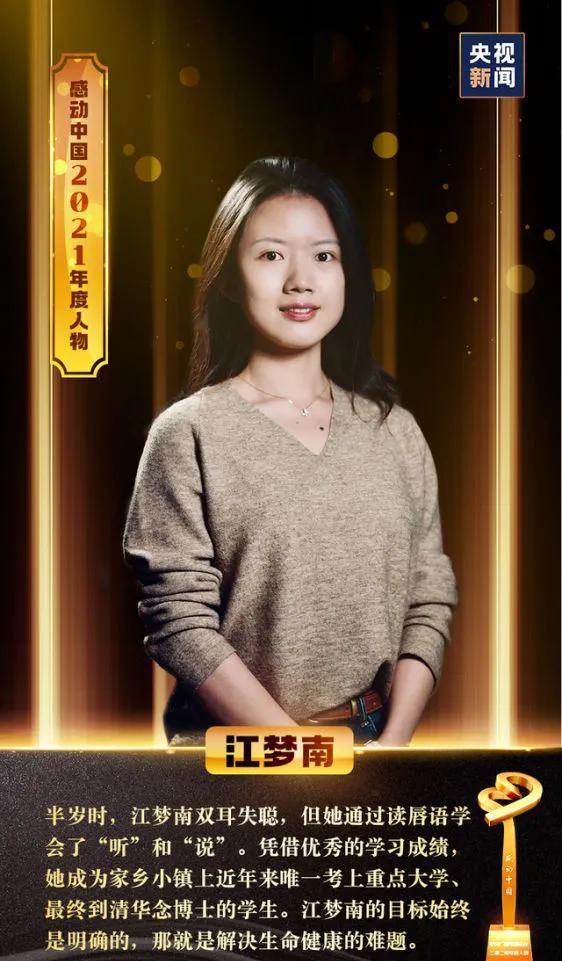 让我印象最深刻的一句话是,江梦南说:“我从来没有因为听不见,就把自己放在一个弱者的位置上。我经常跟别人说,千万不要因为我听不见就放低对我的要求和标准。我可能取得了一点点较小的成绩,我怕他们会因为我听不见,而觉得我取得的这个成绩特别大,放大好几倍,我不太希望他们这样,我更希望他们以一个健全人的标准要求我。解决生命健康的难题,生命科学领域如果有一个难题能够被解决被攻克,那肯定造福的不只是一个人,而是造福所有人。如果我能够做一些什么让别人不再那么辛苦那么艰难,我觉得是一件很有意义的事情,如果每一个人都能够付出一点点努力,这个世界肯定是非常美好的。”