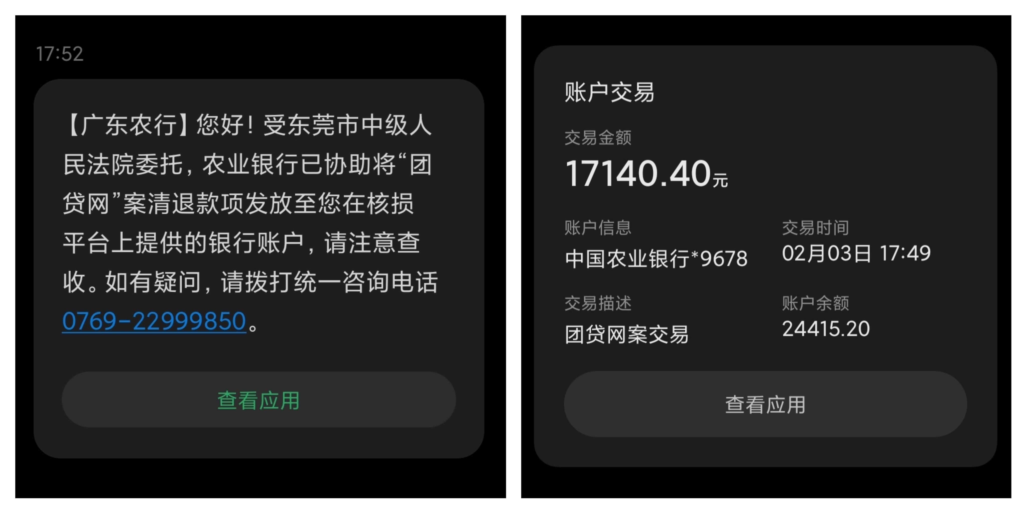 2024 年 2 月 2 日,东莞市中级人民法院发布关于 “团贷网” 案集资参与人资金清退公告,资金清退将于 2024 年 2 月 3 日开始。这意味着自 2019 年 3 月 27 日团贷网暴雷以来,历时五年的荒唐事件终于有了一个实际的结果。我也在 2 月 3 日当天收到了一笔回款 —— 17140.40 元,回款比例为 34.3%。