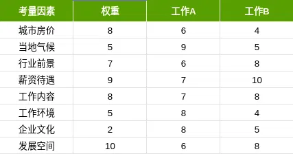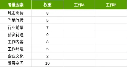 列出最主要的考量因素,比如城市房价、当地气候、行业前景、薪资待遇、工作内容、工作环境、企业文化、发展空间等等,然后给每个考量因素设置权重。权重的设置可以按照分数打分(比如 1-10 分),也可以按照百分制设置不同的权重。