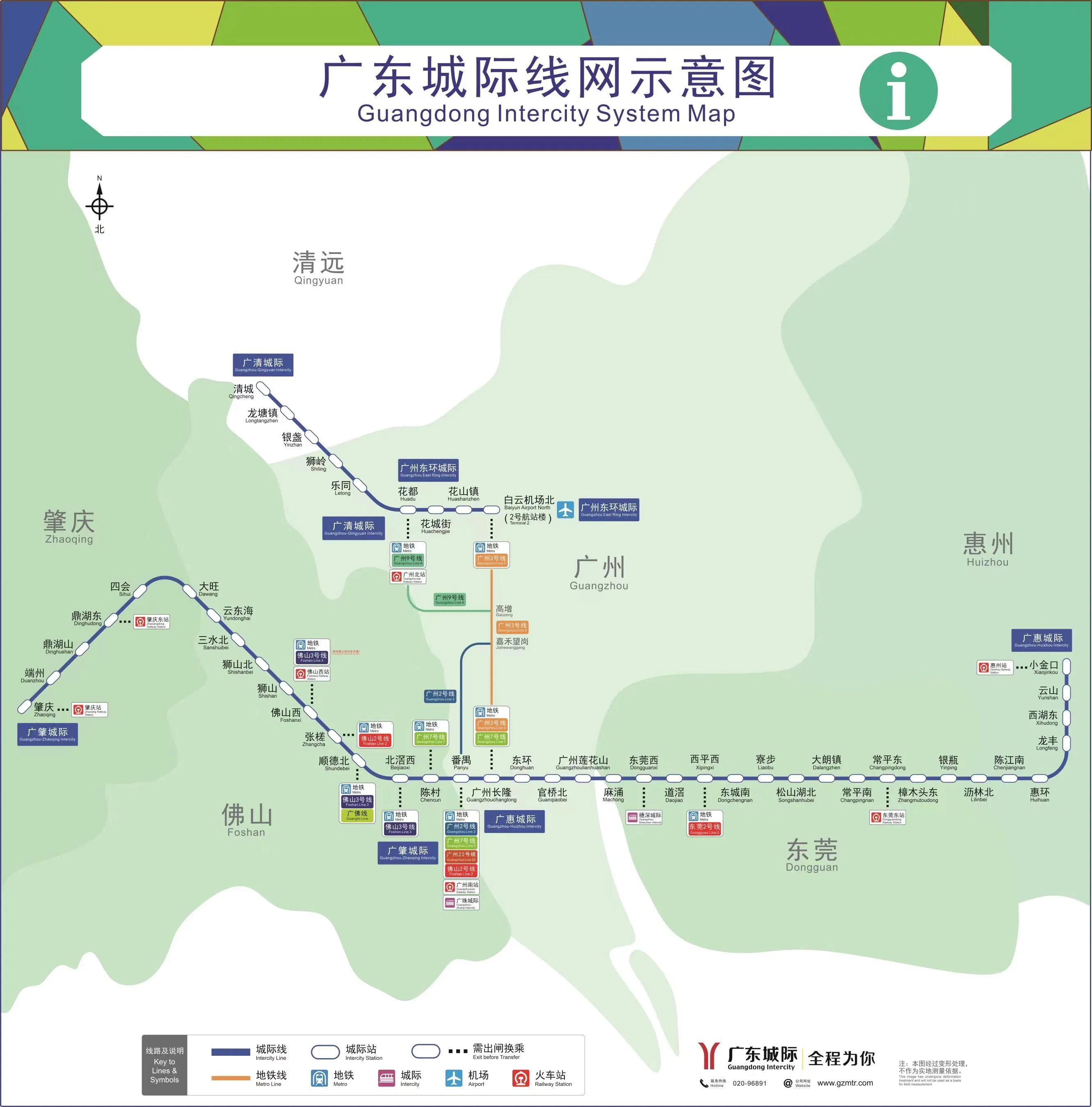 广东城际 “四线” 开通后,以番禺站为中心,向西为广肇城际,向东为广惠城际,全线设 39 座车站。其中,广州 5 座车站、佛山 9 座车站、肇庆 6 座车站、东莞 12 座车站、惠州 7 座车站,列车最高运行时速为 200 公里。