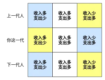以你这一代人为参照标准,上下各一代人,共三代人的收支情况互为因果,决定了你能花多少钱。如果上一代的积累很多,30 岁的人买房、买车的消费压力就会小;如果下一代的收入高,退休后 30 年的生命质量就会高。反之,上一代的压力也可能会传导到第三代。不是只考虑时间或者只考虑自己就可以放心花钱的。
