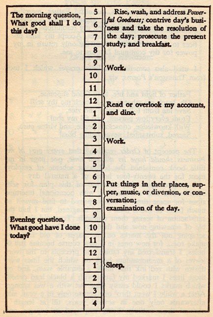 本杰明・富兰克林虽然出身贫寒,只念过两年书,却有着传奇的一生。之所以能取得这么大的成就,其中一个原因就是他出色的时间管理能力。我们来看一下他的 “手帐” —— 24 小时日程表。