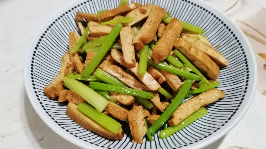 - 热锅冷油加入香干煸炒一下,然后加入芹菜继续煸炒。