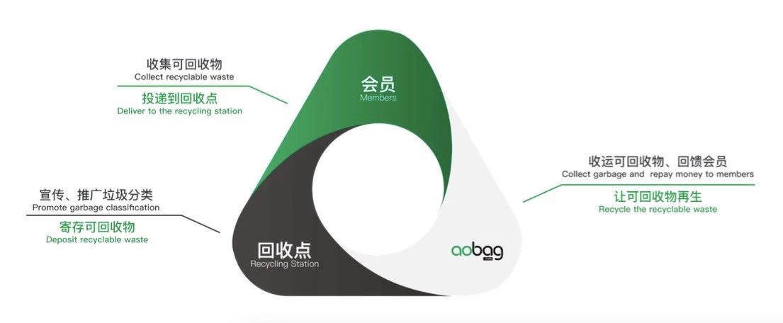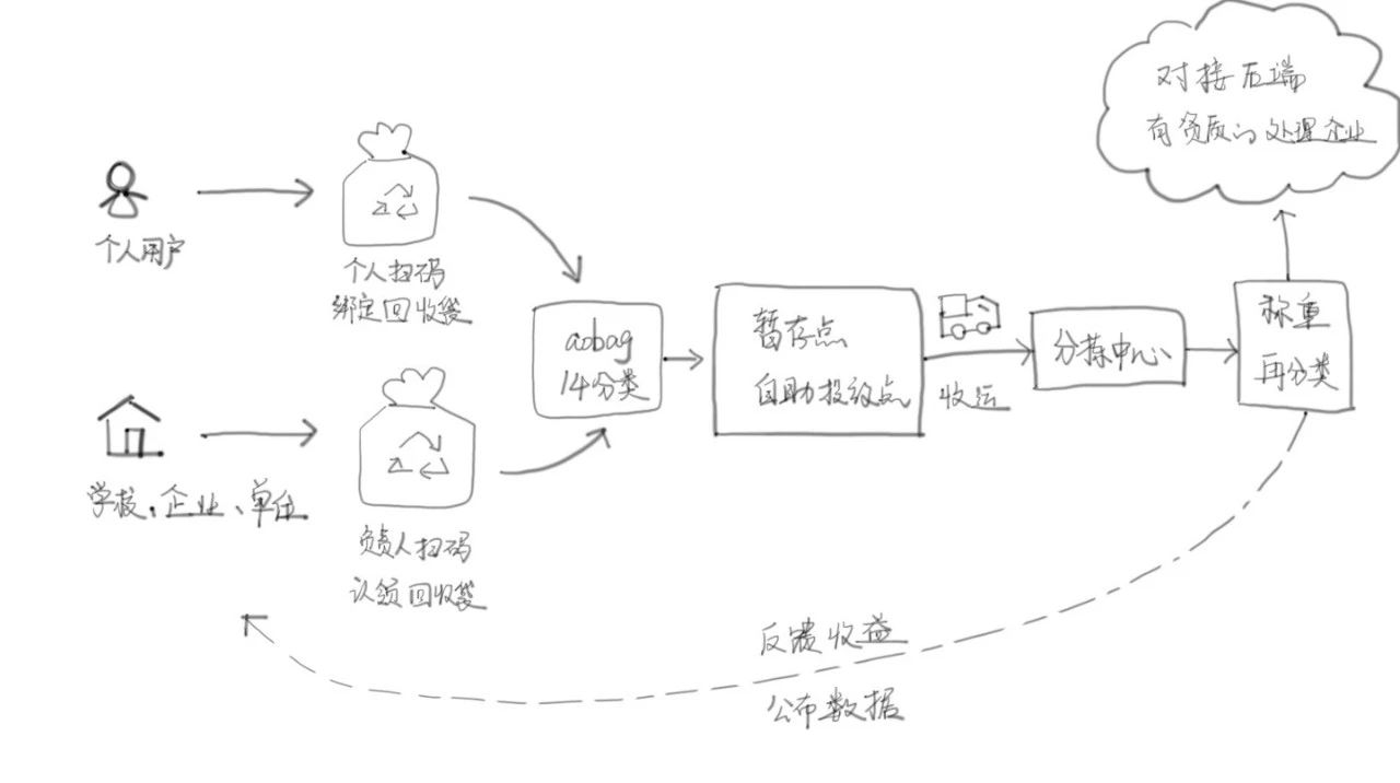 从软件工程的角度来看,aobag 在这里的角色就是一个 API(用户编程接口),一个面向个人、学校、企业的统一的操作接口。通过 aobag 这个接口,实现了前端和后端的解耦合。也就是说,用户不再需要跟废品回收站打交道,前端部分变成了用户按照奥北 14 分类法将可回收物打包在 aobag 中,然后自行选择合适的时间将这一袋 aobag 投递到附近的回收点,done!后端部分统统由奥北负责,包括定期的收运、再分类、称重、对接有资质的处理企业,以及数据分析、反馈等等。